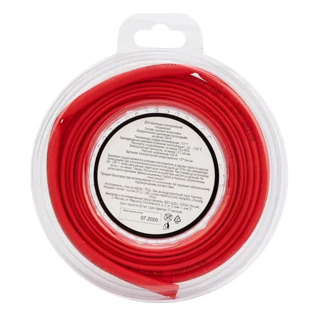 Термоусаживаемая трубка предназначена для восстановления и создания изоляции, герметизации поверхностей и электрических соединений кабелей, бандажирования и маркировки проводов, а также для создания антикоррозийных защитных покрытий. Термоусаживаемая трубка меняет свой диаметр в результате нагрева и принимает форму предмета или материала, на который совершается усадка. Трубка не поддерживает горение: в отсутствие открытого огня затухает и не воспламеняется. Это обеспечивает дополнительную безопасность в случае возникновения пожара. Изделие поставляется в удобном ролике, что позволяет легко отмерить и отрезать необходимую длину, минимизируя отходы. Рекомендуем проводить работы по усадке трубок с помощью специальных электромонтажных фенов и газовых горелок REXANT. Гарантийный срок эксплуатации – 7 лет. Гарантийный срок хранения – 7 лет. Относительное удлинение при разрыве: не менее 200%. Прочность на растяжение: не менее 10,4 Мпа. Электрическая прочность: не менее 19,7 кВ/мм. Рабочее напряжение: 600 В. Удельное электрическое сопротивление: 10^14 Ом/см.