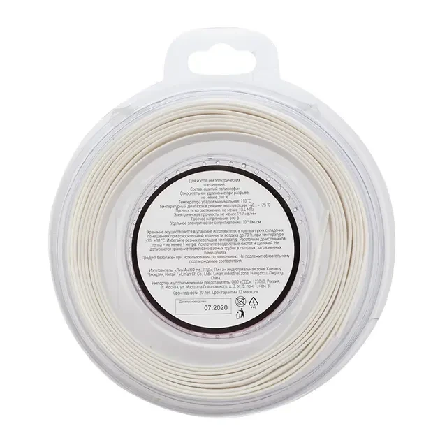Термоусаживаемая трубка предназначена для восстановления и создания изоляции, герметизации поверхностей и электрических соединений кабелей, бандажирования и маркировки проводов, а также для создания антикоррозийных защитных покрытий. Термоусаживаемая трубка меняет свой диаметр в результате нагрева и принимает форму предмета или материала, на который совершается усадка. Трубка не поддерживает горение: в отсутствие открытого огня затухает и не воспламеняется. Это обеспечивает дополнительную безопасность в случае возникновения пожара. Изделие поставляется в удобном ролике, что позволяет легко отмерить и отрезать необходимую длину, минимизируя отходы. Рекомендуем проводить работы по усадке трубок с помощью специальных электромонтажных фенов и газовых горелок REXANT. Гарантийный срок эксплуатации – 7 лет. Гарантийный срок хранения – 7 лет. Относительное удлинение при разрыве: не менее 200%. Прочность на растяжение: не менее 10,4 Мпа. Электрическая прочность: не менее 19,7 кВ/мм. Рабочее напряжение: 600 В. Удельное электрическое сопротивление: 10^14 Ом/см.