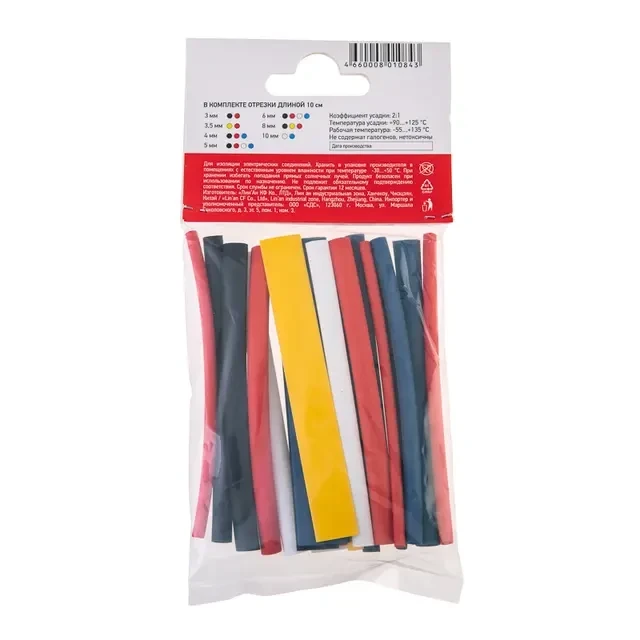 Набор термоусаживаемых трубок AUTO PLUS № 2 подобран специально для удобства использования в автомобилях импортного и отечественного производства. Набор состоит из термоусаживаемых трубок, предназначенных для восстановления и создания изоляции, герметизации проводов автомобиля, маркировки, защиты от коррозии, истирания, пыли, химикатов и механических повреждений. Изделия, входящие в состав набора, выполнены из экологически безопасных материалов, не содержащих галогенов. Трубки не поддерживают горение: в отсутствие открытого огня затухают и не воспламеняются. Это обеспечивает дополнительную безопасность в случае возникновения пожара. Состав набора: 3 мм – 2 шт. (черный, красный); 3,5 мм – 2 шт. (желтый, красный); 4 мм – 3 шт. (черный, красный, синий); 5 мм – 4 шт. (черный, белый, красный, синий); 6 мм – 4 шт. (черный, белый, красный, синий); 8 мм – 3 шт. (черный, желтый, красный); 10 мм – 2 шт. (белый, синий). Гарантийный срок эксплуатации – 7 лет. Гарантийный срок хранения – 7 лет. Рекомендуем проводить работы по усадке трубок с помощью специальных электромонтажных фенов и газовых горелок REXANT.