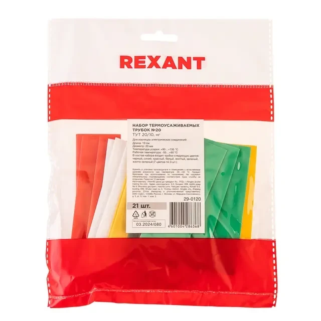 Набор № 20 состоит из термоусаживаемых трубок, предназначенных для восстановления и создания изоляции, герметизации электрических соединений проводов, маркировки, а также для защиты от коррозии, истирания, пыли, химикатов и механических повреждений. В результате нагрева трубки меняют свой диаметр, сжимаются и принимают форму предмета или материала. Коэффициент усадки составляет 2:1. Изделия, входящие в состав набора, выполнены из экологически безопасных материалов, не содержащих галогенов. Трубки не поддерживают горение: в отсутствие открытого огня затухают и не воспламеняются. Это обеспечивает дополнительную безопасность в случае возникновения пожара. В состав набора входят трубки следующих цветов: черный, синий, красный, белый, желтый, зеленый, желто-зеленый (7 цветов по 3 шт.). Диаметр – 20 мм, длина – 10 см. Работы по усадке трубок производятся с помощью специальных электромонтажных фенов и газовых горелок REXANT.