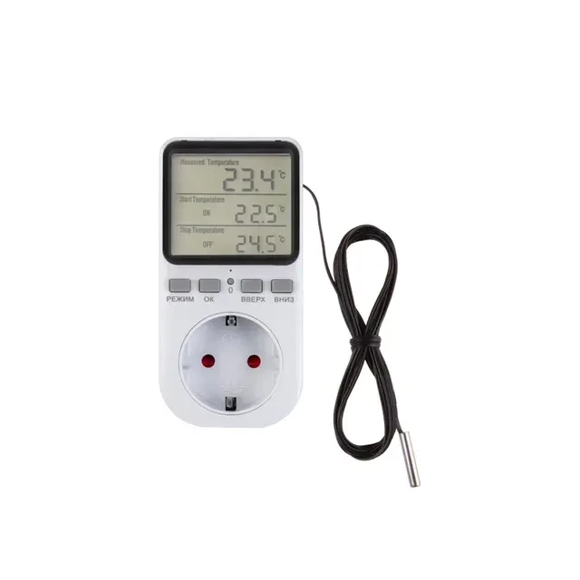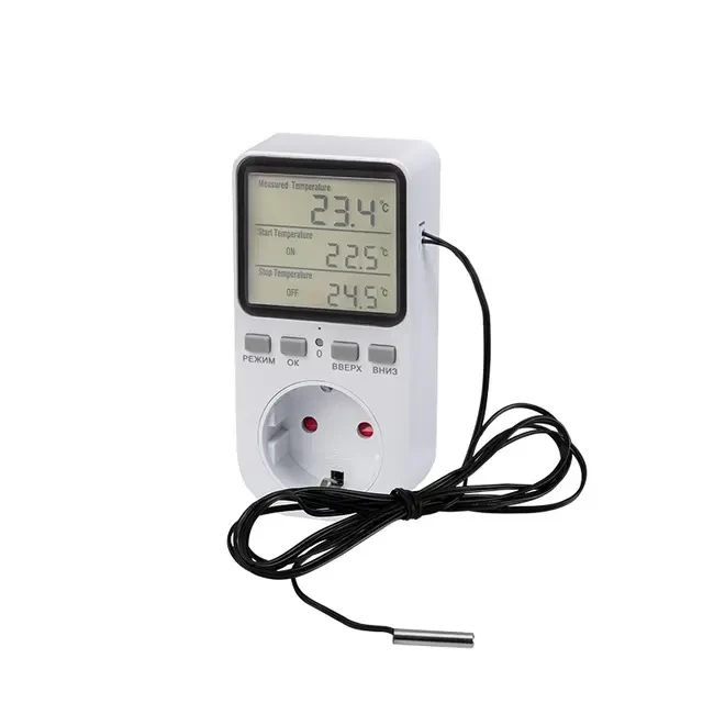 Цифровой терморегулятор в розетку используется для регулирования температуры воздуха в помещении. Устанавливается в жилых домах, теплицах, на рыбных фермах т.д. Может быть интегрирован в систему умного дома. Функции терморегулятора: определение температуры, установка температуры включения и отключения, синхронный цикл включения, отключение и переключение нагрузки во времени. Таймер включения/выключения позволяет запрограммировать работу устройства на срок до 99 минут и 59 секунд, что способствует экономии энергии за счет поддержания заданной температуры в течение определенного времени. Терморегулятор оснащен подсветкой, что позволяет легко считывать данные даже в условиях недостаточного освещения. Длина провода датчика температуры составляет 1,7 м. Диапазон измеряемых температур: от -40℃ до +90℃.