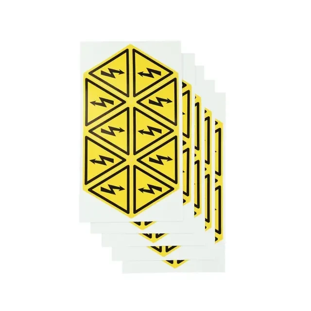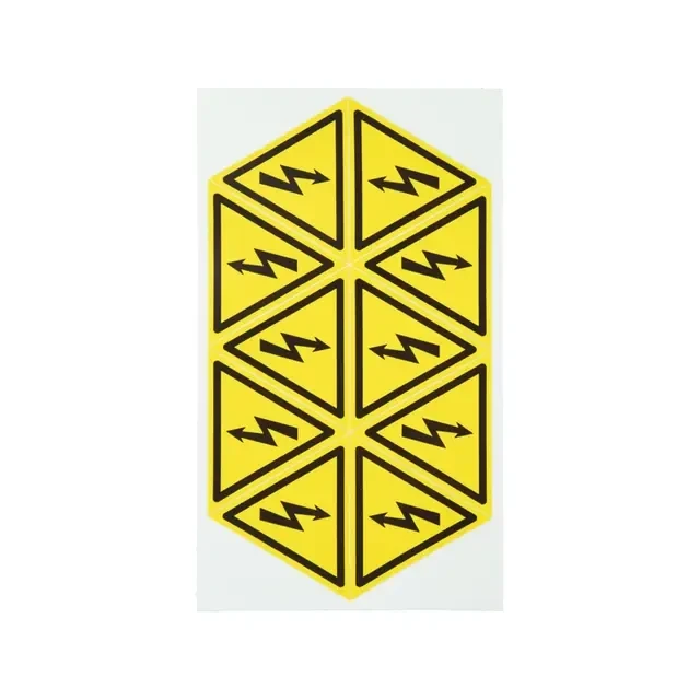 Знак электробезопасности (наклейка) «Опасность поражения электротоком» – это информационный знак, который сообщает об опасности поражения электрическим током. Предназначен для размещения на электрооборудовании, приборах, опорах линий электропередачи, дверцах силовых щитков, электротехнических панелях и шкафах, а также на ограждениях токоведущих частей оборудования, механизмов и приборов. Наклейка используется для предупреждения и информирования окружающих, а также для организации мест работы электромонтажных бригад. Наносится на ровную сухую поверхность. Изделие изготовлено на основе самоклеящейся пленки, разработанной специально для использования на информационных знаках как внутри помещений, так и на улице. Комплект набора: 50 наклеек размером 50х50х50 мм (5 листов, по 10 наклеек на каждом).