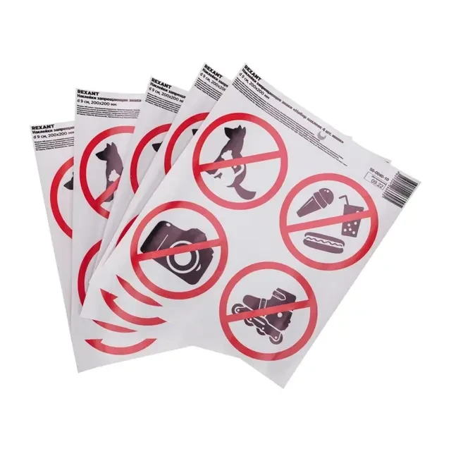 Описание REXANT 56-0040-10 - Купить Наклейки запрещающие знаки «Набор наклеек 4 шт. мини- d 9 см»