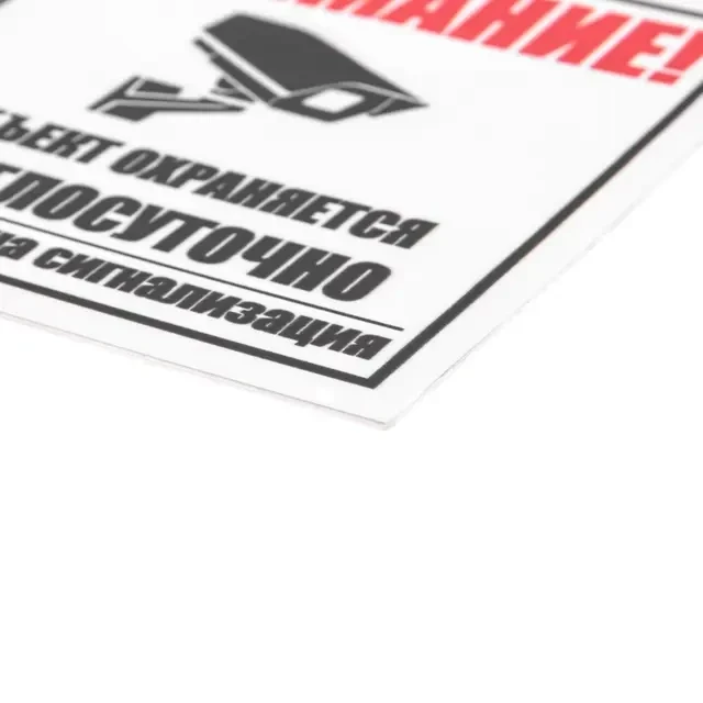Табличка «Внимание, объект охраняется круглосуточно, установлена сигнализация» предназначена для размещения на объектах, находящихся под постоянной охраной с установленными камерами и сигнализацией. Знак предупреждает о мерах безопасности и способствует предотвращению несанкционированных действий на охраняемой территории. Табличка устойчива к погодным воздействиям и механическим повреждениям. Яркие цвета и четкая надпись обеспечивают хорошую видимость знака даже при длительном использовании. Установка таблички проста – возможно крепление с помощью двустороннего скотча или клея «Жидкие гвозди». Табличка поставляется в индивидуальной упаковке с возможностью подвеса на крючок.