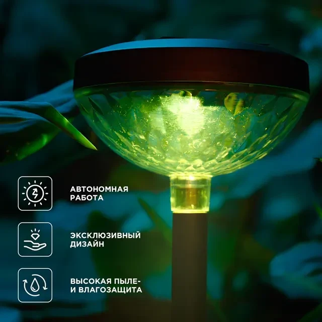 Грунтовый светильник Таянг – это изысканный элемент садового декора, предназначенный для подсветки пешеходных дорожек, тропинок, цветников, а также различных архитектурных деталей ландшафта. Дизайн изделия сочетает в себе современные элементы и восточные мотивы, воплощая дух Пекина – древнего и красивого города с богатой историей. Включенный светильник создает необычные узоры на поверхностях, добавляя загадочности и чарующей прелести ночному саду. Светильник оснащен солнечной панелью, которая поглощает солнечные лучи в течение дня и преобразует их в электрическую энергию. Накопленная энергия хранится во встроенном аккумуляторе, что позволяет светильнику автономно функционировать около 6-8 часов и освещать окружающую территорию вечером и ночью, не требуя подключения к электросети.