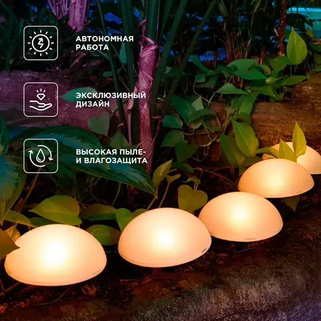 Грунтовый светильник Полусфера – это изысканный элемент садового декора, предназначенный для подсветки пешеходных дорожек, тропинок, цветников, а также различных архитектурных деталей ландшафта. Дизайн изделия создает загадочное свечение, словно волшебные светящиеся камни рассыпаны по вашему саду. Светильник оснащен солнечной панелью, которая поглощает солнечные лучи в течение дня и преобразует их в электрическую энергию. Накопленная энергия хранится во встроенном аккумуляторе, что позволяет светильнику автономно функционировать около 8 часов и освещать окружающую территорию вечером и ночью, не требуя подключения к электросети. Вечерние прогулки в саду, уютные посиделки под звездами и романтические ужины наполнятся волшебством благодаря этому особенному светильнику. Полусферы имеют диаметр 15 см и находятся друг от друга на расстоянии 50 см.