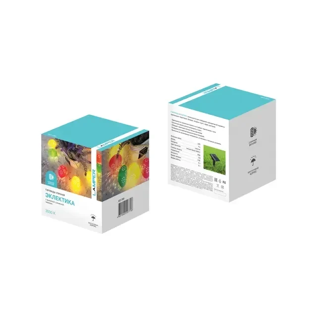 Садовая гирлянда (каскад) Эклектика LAMPER - это оптимальное решение для украшения территории загородного дома, дачи или декорирования пространства перед торжеством. Изделие оснащено солнечной панелью и аккумулятором: заряжается днем в течение 6 часов, а с наступлением темноты дарит приятное холодное белое свечение на протяжении 6 часов. Устройство не требует прокладки проводов и дополнительных элементов установки. 10 разноцветных яйцеобразных фонариков расположены на шнуре длиной 4 м. Так, гирлянда легко крепится в любом месте. При этом панель незаметно размещается по соседству. Ее можно положить на плоскую поверхность или вставить в грунт (в комплекте идет прочный пластиковый колышек). Каскад имеет высокий уровень пыле- и влагозащиты IP65, поэтому может использоваться в непогоду без навеса.