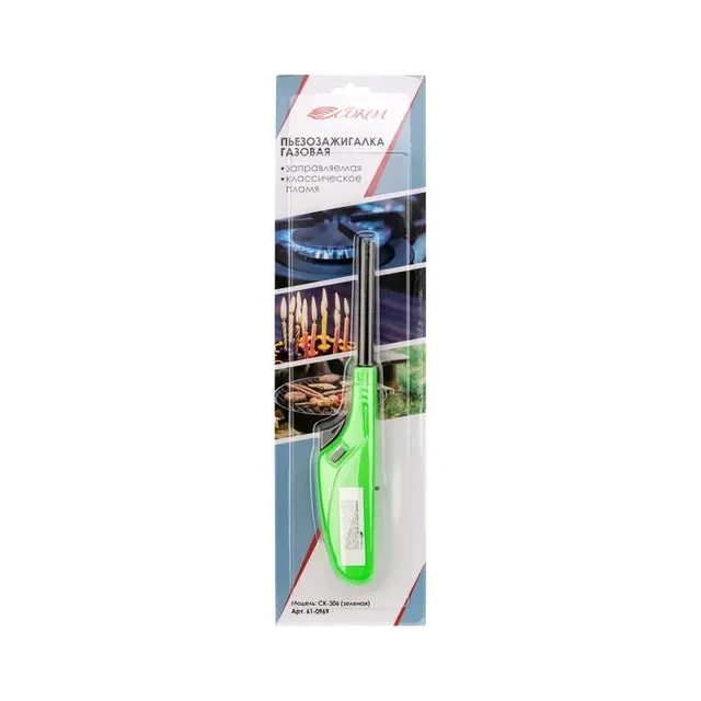 Бытовая пьезозажигалка с классическим пламенем, c держателем. Общие габариты зажигалки: 205х38х25 мм Тип поджига: пьезоэлектрический Цвет: зеленый