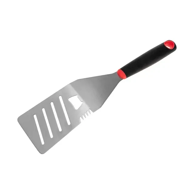 Лопатка для гриля СОКОЛ длиной 38 см имеет широкий функционал. Позволяет переворачивать еду, открывать бутылки, а с помощью зубчиков на одной из сторон – отбивать стейк. Основание шириной 9 см выполнено из прочной нержавеющей стали, не подвергающейся коррозии и существенным изменениям рабочих свойств при длительной эксплуатации. Прибор можно мыть в посудомоечной машине. Длинная рукоятка из термостойкого пластика позволяет перемещать и переворачивать продукты на решетке на безопасном расстоянии от жара, предотвращая ожоги и травмы. Рабочая часть лопатки с отверстиями выполняет функцию шумовки – через отверстия происходит отток лишней жидкости (бульона, соуса или масла).