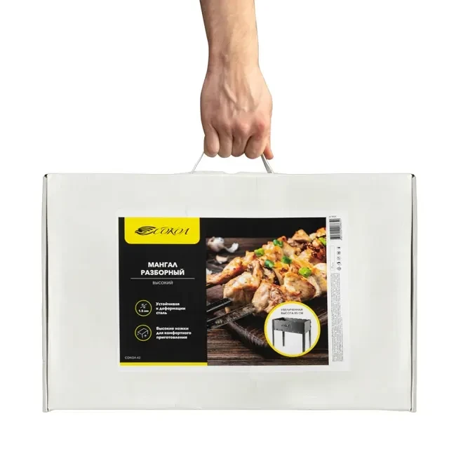 Компактный разборный мангал СОКОЛ изготовлен из стали увеличенной толщины, поэтому не подвергается тепловым деформациям от углей и дров. Предназначен для многоразового использования. Сборка и установка мангала производится вручную без использования специальных инструментов. На стенках жаровни предусмотрены специальные прорези, которые позволяют разместить до 6 шампуров. Есть отверстия для интенсивного горения. Общая высота ножек 850 мм оптимальна и удобна для приготовления шашлыков. Жаровня размером 445х295 мм и глубиной 155 мм позволяет разместить шампуры и получить порцию блюда, рассчитанную на небольшую компанию. Толщина стенки – 1,5 мм. Конструкция фиксируется гайками типа «барашек» (идут в комплекте). В разобранном виде мангал не занимает много места, легко помещается в багажник автомобиля. Поставляется в картонной коробке, дополненной удобной ручкой для транспортировки. Масса – 8,7 кг. Объем полезный, не менее: 20 л.