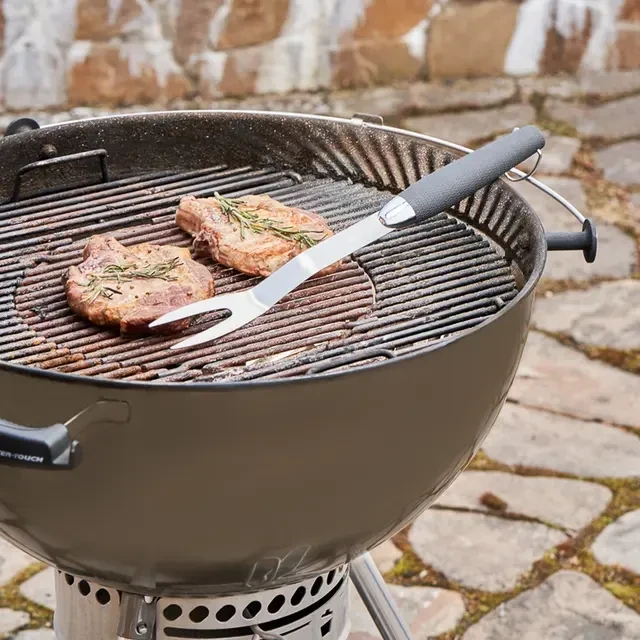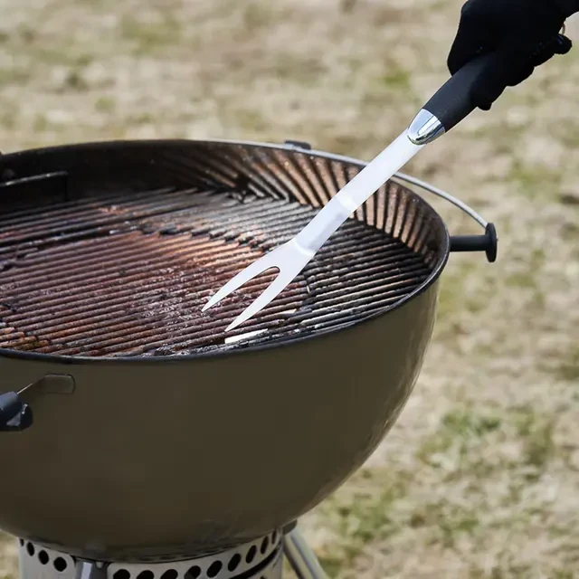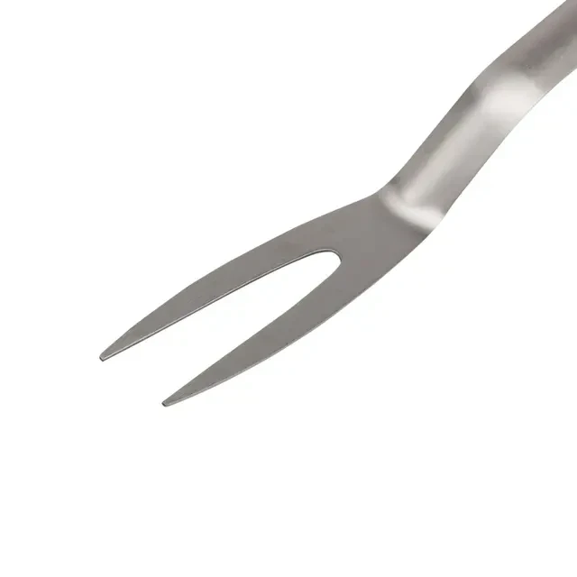 Вилка для гриля серии Комфорт изготовлена из прочной нержавеющей стали, не подвергающейся коррозии и изменениям рабочих свойств. Прибор можно мыть в посудомоечной машине. Термопластичная резина в составе рукоятки отвечает за безопасность применения и уберегает от случайных ожогов и травм. Вилка с 2 заостренными зубцами служит для удержания продукта. Она не повреждает кусок, а бережно захватывает для дальнейшей сервировки. Вилка может использоваться совместно с ножом для одновременного удержания продуктов (мяса, рыбы, овощей) и их нарезки. Размер изделия: 445х40х1,5 мм.