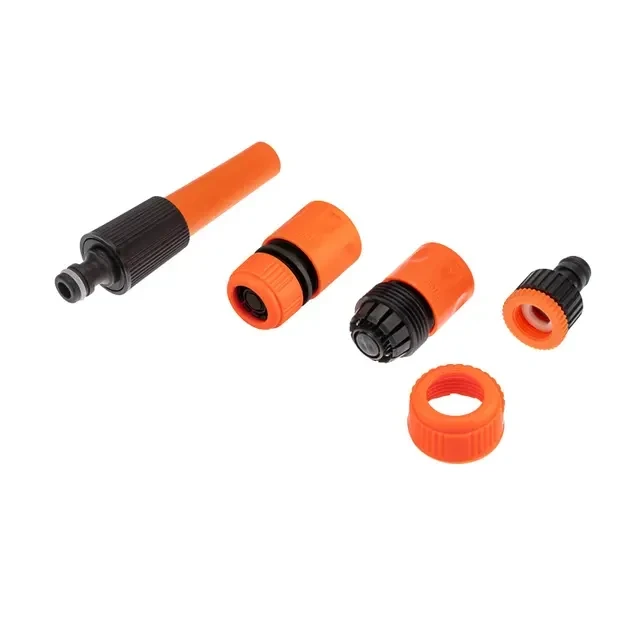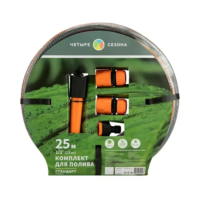 Набор предназначен для полива сада, огорода или газона. В наборе собраны все необходимые элементы: шланг, 2 коннектора, адаптер и распылитель. Шланг выполнен из высококачественного ПВХ. Трехслойная структура создает дополнительную прочность. Армирование придает стойкость к нагрузкам и позволяет выдерживать высокое давление воды. Коннекторы предназначены для подключения к шлангу пистолетов-распылителей, различных насадок и т.д. Один из коннекторов оснащен функцией «аквастоп», которая позволяет подключать к шлангу насадки, не перекрывая подачу воды. Распылитель позволяет легко регулировать поток воды. Адаптер служит для подключения шланга к любому водопроводному крану в саду.