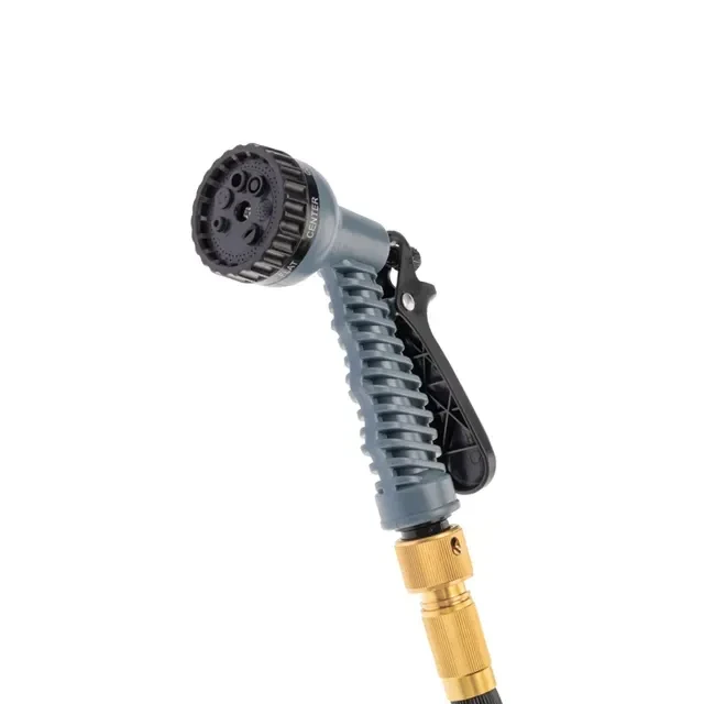 Поливочный набор применяется при организации систем полива и систем водоснабжения. Включает в себя растягивающийся шланг, пистолет-распылитель, а также коннекторы для соединения. Поливочный шланг устойчив к износу и воздействию внешних факторов, не образует перегибов. При подаче воды шланг растягивается до 45 метров. При хранении не занимает много места. Пистолет-распылитель оснащен эргономичной ручкой, благодаря которой изделие удобно и комфортно держать в руке. Имеет 7 режимов подачи воды, регулируемых поворотной головкой. Также на пистолете предусмотрен фиксатор, позволяющий зафиксировать курок и не зажимать его пальцами в процессе полива. Набор комплектуется соединителями для быстрого и удобного подключения шланга к поливочной системе.