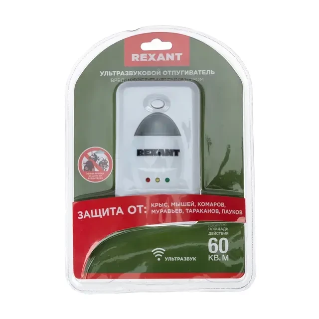 Ультразвуковой отпугиватель вредителей REXANT с LED индикатором предназначен для избавления от грызунов, пауков, тараканов, муравьев, моли и других вредителей путем излучения ультразвуковых волн на дискомфортных для них частотах. Отпугиватель является компактным и простым в эксплуатации устройством, обеспечивающим надежную защиту помещения. Безопасен для людей и домашних животных, не содержит химикатов. Площадь действия составляет 60 м².