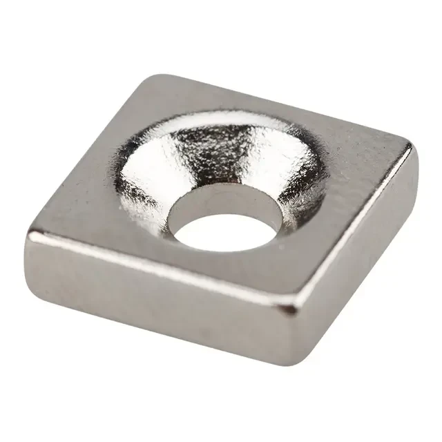 Постоянный редкоземельный неодимовый магнит-прямоугольник с зенковкой предназначен для создания сильного магнитного поля. Используется для фиксации и зажима металлических предметов: крепления жалюзи, баннера или автомобильного кузова, создания застежки на портфелях, кейсах, чемоданах, сумках. Находит множество применений в быту и промышленности. Магнит изготовлен из сплава N42, который хорошо подходит для применения в быту и промышленности. Практически не подвержен размагничиванию. Благодаря зенковке магнит легко крепится саморезом или шурупом к поверхностям из различных материалов. Из-за особенностей структуры сплав N42 достаточно хрупкий. Чтобы повысить прочность магнита, его дополнительно прессуют и покрывают никелем. Покрытие: никель (Ni). Рабочая температура: -60...+80 °С. Вес: 5 г.