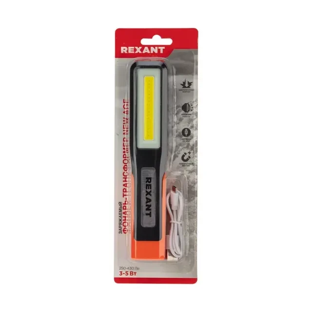 Фонарь заряжаемый NEW AGE рабочий/поисковый/автомобильный, дальний свет 3 Вт/ближний свет 6 Вт/аварийный красный СОВ REXANT, поворотный, магнит используется для различных ремонтных работ, в походах, в автомастерских. Мощные диоды СОВ нового поколения с заливающим светом оптимально освещают пространство, также есть отдельный головной дальний свет для освещения пути на 150 метров. Противоударный корпус прожектора надежно фиксируется в руке, а при случайных падениях фонарь сохраняет свою работоспособность. Фонарь также может работать во время зарядки. USB-кабель в комплекте, от кабеля фонарь можно заряжать не только от сетевого блока питания с USB-разъемом, но и в автомобиле. Долговечный аккумулятор позволяет сэкономить значительную сумму, которая бы ушла на сменные батарейки. Технические характеристики Дальний свет: 3 Вт Ближний свет: 5 Вт 100% Световой поток дальнего света: 250 Лм Световой поток ближнего света: 430 Лм Красный свет, мигающий красный свет Тип аккумулятора: Li-Ion Поворотный магнит USB-кабель в комплекте Складной крюк