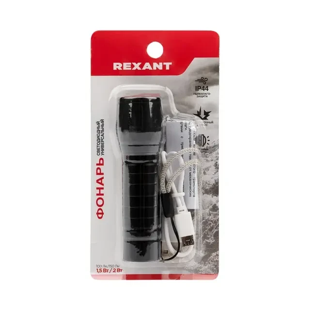Фонарь универсальный, трехрежимный, в алюминиевом корпусе, компактный, со встроенным аккумулятором, USB кабель в комплекте REXANT