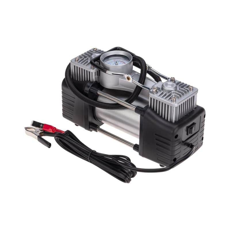 Усиленный металлический автомобильный компрессор используется для накачивания шин легковых автомобилей, кроссоверов, внедорожников и малого коммерческого транспорта. Питание осуществляется от АКБ автомобиля. Компрессор обладает высокой производительностью 60 л/мин. Оснащен мощным электрическим двухпоршневым двигателем и системой повышенной безопасности. Предусмотрена защита от перегрева. Устройство рассчитано на длительную эксплуатацию в суровых климатических условиях. Может быть использовано для больших колес. В комплекте поставляются переходники для накачивания мячей, матрасов, резиновых лодок. Комплектация: компрессор автомобильный – 1 шт., пневмошланг – 1 шт., сумка для хранения – 1шт., упаковка – 1 шт., паспорт изделия – 1 шт., насадки – 3 шт.