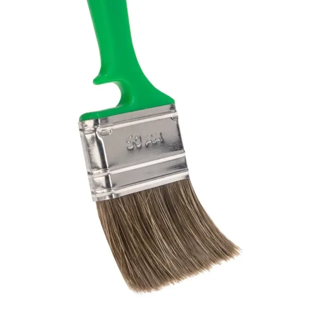 Кисть «Работы по дереву» отлично работает по шероховатым поверхностям, обладает износостойкой смешанной щетиной, отлично покрывающей дерево пропитками, глазурями и краской. Может применяться с эмалями и для проведения фасадных работ. Эргономичная пластиковая ручка кисти удобна в применении. Средний размер кисти позволяет равномерно прокрасить небольшие плоские поверхности и плинтусы. Технические характеристики: Тип: кисть плоская Размер кисти: 50х12 мм Длина щетины: 51 мм Длина ручки: 130 мм Материал рукояти: пластик Материал бандажа: металл Щетина: смешанная