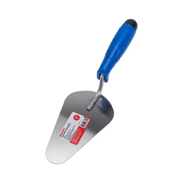 Кельма печника позволяет осуществить отделочные и строительные работы по укладке плитки или кирпича. С ее помощью можно отмерить необходимое количество смеси, аккуратно нанести и выровнять ее. Также кельма легко удаляет излишки раствора и позволяет заполнять вертикальные швы. Материал изготовления – нержавеющая сталь, что способствует высокой устойчивости к коррозии и воздействию агрессивных веществ. Ручка выполнена из ударопрочного пластика и надежно приварена к полотну, что обеспечивает стойкость к интенсивному использованию. Благодаря рельефной поверхности ручка удобно лежит в руке и не выскальзывает во время работы. Предусмотрен затыльник из ABS пластика, которым можно простукивать плитку для корректировки ее положения и лучшей усадки.