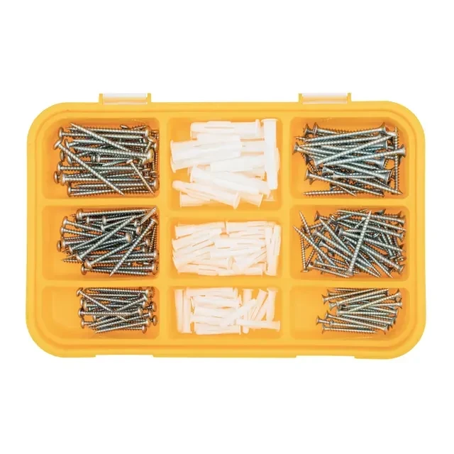 Набор саморезов и дюбелей предназначен для выполнения крепежных работ: фиксации различных предметов и деталей к основаниям из дерева, бетона, кирпича. Саморезы изготовлены из стали, покрытой цинком, что обеспечивает изделиям высокую прочность и долговечность. В наборе два вида саморезов: с полукруглой головкой для надежного крепления тонколистовых материалов и с потайной головкой – используются там, где крепеж не должен выступать над поверхностью материала. Специальные зубцы и блокировочные язычки дюбелей обеспечивают максимальную силу трения в основании, препятствуя проворачиванию и вырыванию крепежа. Набор состоит из 260 крепежных элементов, которых хватит для выполнения множества задач, поставляется в пластиковом органайзере, который помогает не только удобно хранить изделия, но и быстро находить крепеж нужного размера. Органайзер может в дальнейшем использоваться для хранения других крепежных элементов. Состав набора: – саморезы с полукруглой головкой, PH 5,0х60 мм (20 шт.); 4,5х50 мм (20 шт.); 4,0х40 мм (20 шт.); 3,5х35 мм (20 шт.); 3,5х30 мм (20 шт.); – саморезы с потайной головкой, PH 5,0х60 мм (20 шт.); 4,5х50 мм (20 шт.); 4,0х40 мм (20 шт.); 3,5х35 мм (20 шт.); 3,5х30 мм (20 шт.); – пластиковые дюбели ⌀8 (20 шт.); ⌀6 (20 шт.); ⌀5 (20 шт.).