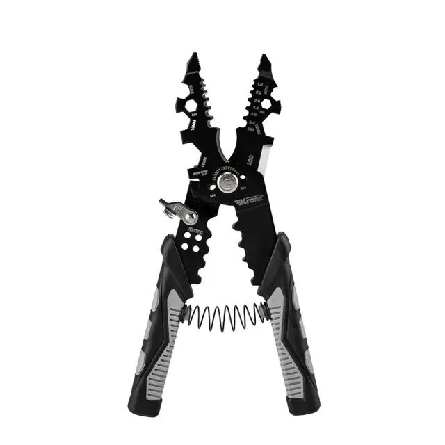 Многофункциональные плоскогубцы 15 в 1 предназначены для выполнения различных электромонтажных работ. Плоскогубцы изготовлены из хромованадиевой стали высокой твердости и обладают защитным антикоррозийным покрытием. Рукоятки эргономичной формы снижают усталость при длительном использовании. Прорезиненное покрытие гарантирует надежный захват и предотвращает скольжение. Пружина между ручками упрощает работу с инструментом и делает использование более эффективным и удобным. Для удобства хранения предусмотрен специальный фиксатор закрытого положения. Функции: 1. Зажим 2. Тонкогубцы 3. Стриппер для снятия изоляции провода сечением от 1,6 до 5,8 мм² 4. Кабелерез 5. Резак для зачистки изоляции 6. Инструмент для обжима клемм 7. Скрутка жил 8. Обрезка проволоки и гвоздей 9. Ключи 5, 6, 7, 8, 10, 13, 14 мм