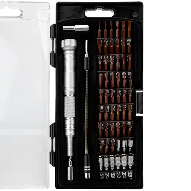 Набор отверток для точных работ KRANZ отлично подходит для ремонта телефонов, компьютеров, приемников и для многих популярных приборов, которые используются в быту. Выполнен из качественной японской стали S2, обладающей высокой прочностью к механическим повреждениям. Точно подобранные по характеристикам магнитные насадки отлично подходят как для профессионального ремонта, так и для мелких бытовых работ. В наборе 62 предмета: M2.5, M3.0, M3.5, M4.0, M4.5, M5.0 SL1.0, SL1.5, SL2.0, SL2.5, SL3.0, SL3.5, SL4.0 PH000, PH00, PH0, PH1.0*2, PH1.5, PH2.0, PH2.5, PH3.5 H0.9, H1.3, H1.5, H2.0, H2.5, H3.0, H3.5, H4.0, H4.5, H5.0, H6.0 T2, T3, T4, T5, T6, T7, T8, T9, T10, T15, T20 Triangle: 2.3 Tri-wing: 2.0, 3.0 Pentable 0.8, 1.2, 1.5, 2.0 SQ: SQ 0, SQ 1, SQ 2 U2.6 Special PH1.5 Рукоятка Гибкий удлинитель Переходники H4.0 и H6,3 Посадка бит: 1,8