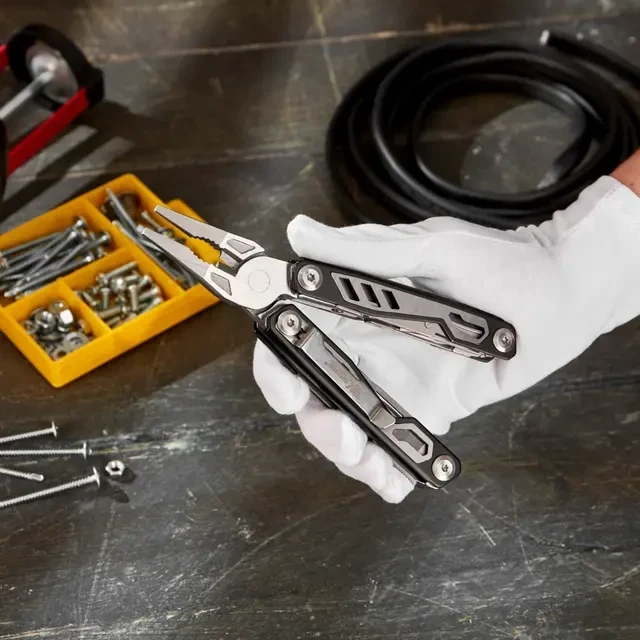 Мультитул 14 в 1 KRANZ – это многофункциональный инструмент, который используется для выполнения широкого спектра действий. Популярен среди специалистов многих областей, а также в быту. Удобный, легкий и компактный инструмент выполнен из нержавеющей стали и оснащен предохранительным замком. В открытом положении размер составляет 155 мм, в закрытом – 100 мм. Вес: 210 г. Комплектация мультитула: 1. Пассатижи рифленые 2. Плоскогубцы 3. Кусачки 4. Инструмент для зачистки проводов 5. Пила 6. Открывалка для бутылок 7. Шлицевая отвертка средняя 8. Ножницы 9. Открывашка 10. Отвертка шлицевая малая 11. Зубчатый нож 12. Нож 13. Шлицевая отвертка большая 14. Крестообразная отвертка