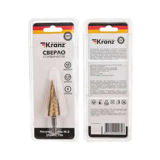 Ступенчатое сверло KRANZ применяется при выполнении монтажно-сборочных работ для сверления отверстий различных диаметров без перестановки режущего инструмента. Применяется в работе с такими материалами, как пластик, дерево, металл и др. Благодаря своей уникальной конструкции изделие заменяет целый набор традиционных спиральных сверл. Использование оснастки позволяет сэкономить время мастера, так как не требует предварительного кернения и сверления. Шестигранный хвостовик Е6,3 обеспечивает надежную фиксацию сверла во всех типах патронов шуруповертов и дрелей. Форма канавки – спиральная. На каждой из 9 ступеней сверла нанесена маркировка фактического диаметра. Диапазон ступеней: 4, 6, 8, 10, 12, 14, 16, 18, 20 (шаг 2 мм). Сверло изготовлено из стали М2 (Р6М5) и обладает высокой прочностью, а также устойчивостью к динамическим нагрузкам и перегреву. Покрытие из нитрида титана (TiN) обеспечивает стойкость инструмента к коррозии и перегреву при сверлении.