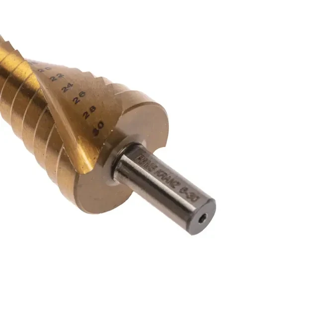Ступенчатое сверло KRANZ предназначено для сверления отверстий различных диаметров одним сверлом в материалах толщиной до 5 мм (сталь, цветные металлы, нержавейка, пластик, дерево). На каждую ступень сверла нанесена маркировка фактического диаметра. Изделие оснащено трехгранным хвостовиком, что предотвращает проворачивание в зажимных патронах. Сверло изготовлено из высококачественной быстрорежущей стали Р6М5, которая обеспечивает надежность, стабильное качество работы, долгий ресурс и высокую производительность. Сверление металла становится более легким благодаря спиральной форме профиля. Покрытие из нитрид-титана предотвращает преждевременный износ инструмента и образование коррозии. Обладает высокой прочностью и повышенной точностью в отличие от обычных сверл данного типа.