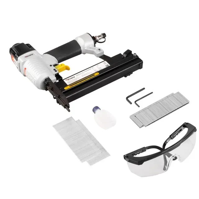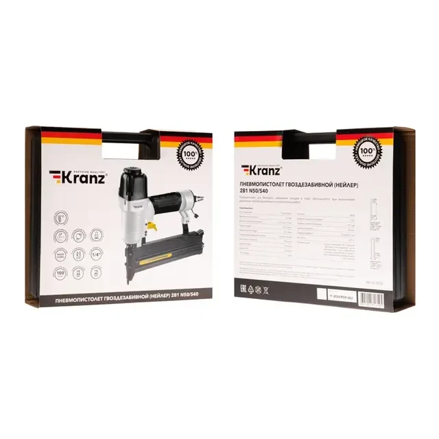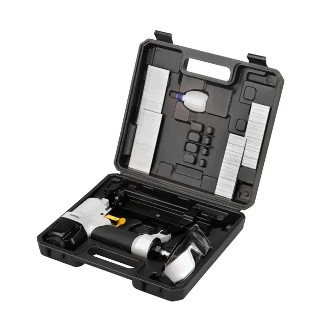 Пневмопистолет (нейлер) 2 в 1 предназначен для быстрого забивания гвоздей и скоб. Используется при выполнении различных производственных и строительных работ. Инструмент работает от компрессора на сжатом воздухе. Легко подключается к компрессору с помощью быстросъемного соединителя Rapid (EURO) с резьбой 1/4". Пневмопистолет способен забивать гвозди от 15 до 50 мм, а также скобы от 16 до 40 мм. Вместимость магазина – 100 шт. Рабочее давление – от 5,5 до 8,3 бар. Регулировка глубины забивания гвоздей и скоб обеспечивает качественное и аккуратное выполнение работ. За счет увеличенного расстояния между рукояткой и открытой обоймой (85 мм) установка цельной кассеты со скобами осуществляется без разделения скоб на части. Благодаря прорезиненной рукоятке нейлер не скользит в руках, что делает работу более удобной и комфортной. Пневматический нейлер является пожаробезопасным инструментом. В комплекте поставляются 2 кассеты гвоздей размером 50 мм и 2 кассеты скоб размером 40 мм.
