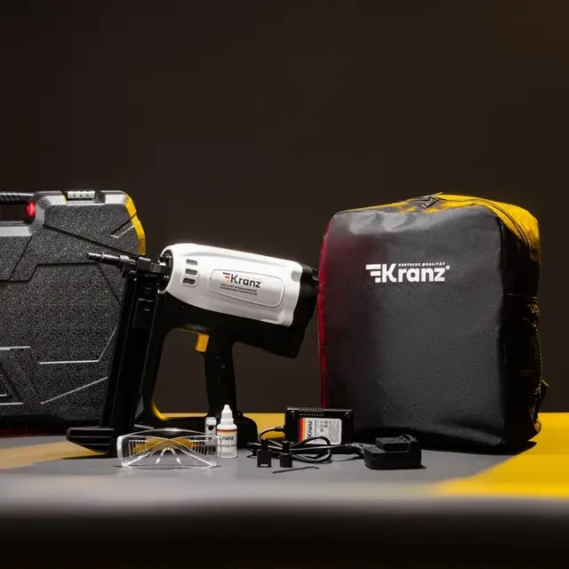 Гвоздезабивной газовый пистолет предназначен для быстрого монтажа крепежных изделий к бетонным поверхностям, кирпичной кладе и изделиям из металлопроката. Инструмент обладает силой удара в 100 Дж, что позволяет забивать гвозди длиной от 15 до 40 мм и диаметром от 2,7 до 3,05 мм. Емкость магазина – 30 гвоздей. Одного газового баллона хватает на 1100 гвоздей. Длина баллона без учета пластикового клапана 165 мм. При производстве применяются современные технологии закалки. Твердость сопел равна 52 HRC, что уменьшает износ и способствует стабильной, надежной и продолжительной работе инструмента. Твердость бойка – 62 HRC. Для увеличения ресурса инструмента в электродвигателе используют высококачественные японские компоненты. Цилиндры (камера сгорания) произведены из литого алюминия. Обработка поверхности цилиндров осуществляется на станках с ЧПУ, что способствует более высокой точности обработки всех деталей и сокращению брака. В комплекте поставляются 3 быстросъемные насадки для работы с различным крепежом.
