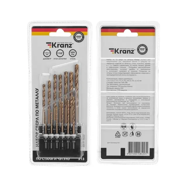 Набор из 13 сверл по металлу KRANZ (1,5-6,5 мм) предназначен для сверления мягких и средних по твердости изделий из металла, стали, пластика, дерева и т.д. Сверла совместимы со всеми типами дрелей и сверлильных станков. Оснащены шестигранными хвостовиками. Изделия выполнены из высококачественной быстрорежущей стали, что обеспечивает долгий ресурс работы и высокую производительность. Сверла обладают пониженным коэффициентом трения и обеспечивают эффективный отвод стружки. Рабочая часть сверл позволяет быстро и надежно сверлить металл, гарантирует ровные и аккуратные отверстия. Заточка режущей части под углом 118 градусов подходит для большинства видов изделий из металла и сталей. Покрытие из нитрид-титана предотвращает преждевременный износ инструмента и образование коррозии. Набор поставляется со специальным держателем, что делает процесс хранения и использования удобным и практичным. Комплект содержит сверла часто используемых диаметров: 1,5-2-2,5-3-3,2-3,5-4-4,5-4,8-5-5,5-6-6,5 мм.