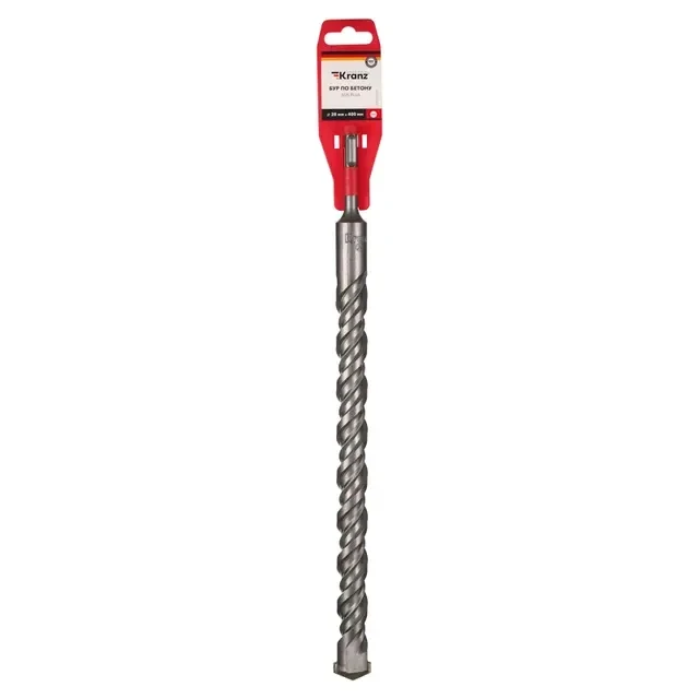 Бур по бетону с хвостовиком SDS PLUS 28x400 мм KRANZ используется во время строительных и ремонтных работ. Предназначен для сверления и бурения отверстий в слабоармированном бетоне, граните, кирпичной кладке и камне при помощи перфоратора с креплением SDS PLUS, которое используется в большинстве электроинструментов бытового и профессионального назначения. Изделие выполнено из качественной стали, что обеспечивает долгий ресурс работы и высокую производительность. Конструкция со стабилизирующей спиралью сохраняет точное положение бура во время сверления и равномерно распределяет ударную нагрузку, кромки с 2 гранями обеспечивают легкое выведение шлама и мелких частиц пыли из рабочей зоны, что поддерживает скорость работы, а усиленный резец предотвращает заклинивание оснастки в арматуре. Твердосплавная вставка на конце бура способствует эффективному входу в материал, что увеличивает цикл службы оснастки и уменьшает износ сверла. Технические характеристики: Диаметр: 28 мм Тип хвостовика: SDS PLUS Общая длина: 400 мм Рабочая длина: 340 мм Количество граней: 2 Материал тела бура: инструментальная сталь (40cr) Материал вставки на конце бура: карбидный сплав (YG8C)