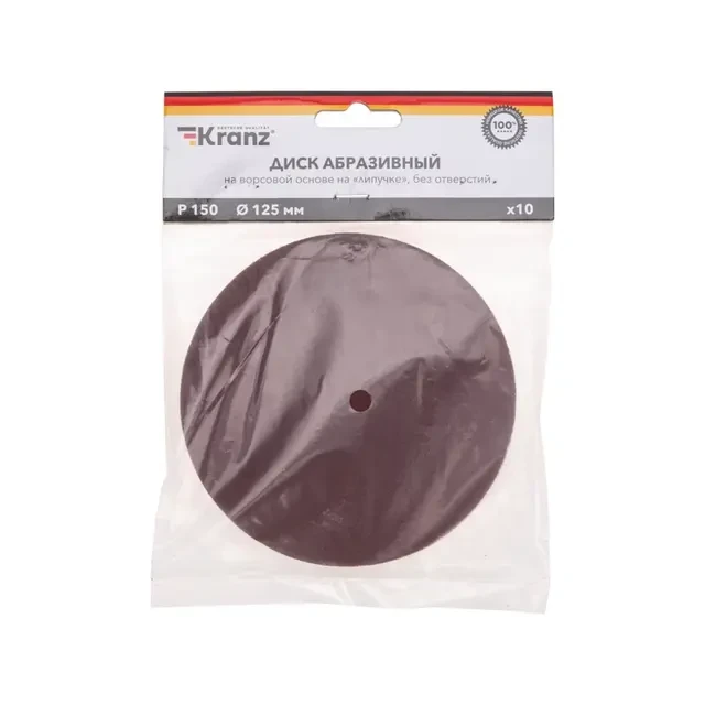 Диск абразивный на ворсовой основе, на липучке, без отверстий, P150, 125мм, 10 шт. KRANZ