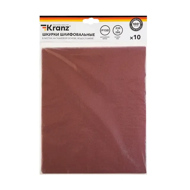 Шкурки шлифовальные в листах на тканевой основе, водостойкие 230х280мм, Р150 (10 шт/уп) KRANZ