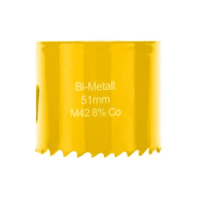 Коронка Bimetal используется во время электромонтажных работ и прокладки коммуникаций. Позволяет получить отверстия большого диаметра в таких материалах как пластик, дерево, сталь, металл и т.д. Применяется совместно с дрелями, перфораторами и стационарными станками. Тело коронки выполнено из инструментальной стали, а зубья с переменным шагом 4-6 мм изготовлены из быстрорежущей стали Р6М5К8, устойчивой к перегреву. Благодаря качеству используемых материалов оснастка отличается долгим ресурсом работы и высокой производительностью. Конструкция оснащена отверстиями, которые компенсируют деформации при перегреве, а также отводят строительную пыль и шлам. Особая заточка зубьев способствует эффективному входу в материал, что позволяет вырезать отверстия правильной круглой формы без сколов и трещин. Коронка используется с шестигранным хвостовиком для сверления при помощи дрели или с хвостовиком SDS PLUS для сверления при помощи перфоратора. Хвостовики приобретаются отдельно. Сверление металла/стали необходимо осуществлять в безударном режиме с применением СОЖ.