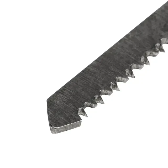 Полотно для электролобзика предназначено для очень чистого криволинейного распила древесины толщиной от 2 до 20 мм. Подходит как для бытового, так и для профессионального применения, будет полезно при проведении столярных, ремонтных и строительных работ. Полотно пилки выполнено из высокоуглеродистой стали, поэтому отличается прочностью и долговечностью. Режущая кромка состоит из зубьев с шагом 1,2 мм и предназначена для чистого фигурного пропила без заусенцев. Улучшенная закалка токами высокой частоты увеличивает твердость зубьев и обеспечивает высокий ресурс. Универсальный Т-образный хвостовик подходит для установки на большинство моделей электролобзиков. Комплект состоит из двух полотен и рассчитан на выполнение большого объема работ.
