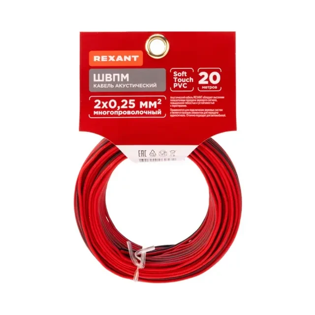 Акустический кабель REXANT 2х0,25 мм² используется для подключения звуковых систем и является залогом отличного звука домашней или автомобильной аудиоаппаратуры. Выступает в качестве важного элемента для передачи аудиосигнала. Состоит из двух многожильных проводников, расположенных параллельно друг другу. Проводники находятся в изоляции, которая защищает от внешних помех и механических повреждений. Материал изоляции – ПВХ, цвет – красно-черный. Изделие обладает разделительным основанием, что позволяет разъединять проводники без повреждения изоляции и оголения жил. Кабель поставляется в бухте длиной 20 метров.