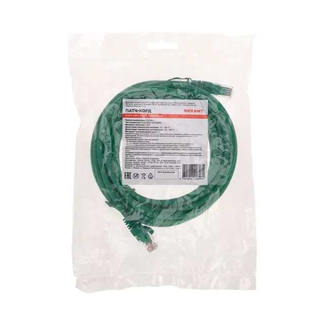 Патч-корд предназначен для подключения активного и пассивного сетевого оборудования в составе структурированной кабельной системы. Необходим для соединения телекоммуникационного оборудования: компьютеров, офисных АТС, сетевых коммутаторов, концентраторов, коммутационных панелей, маршрутизаторов, патч-панелей в телекоммуникационных стойках, сетевых карт, а также другого оборудования, имеющего разъемы RJ-45. Патч-корд представляет собой шнур из 4 пар изолированных проводников, скрученных между собой, находящихся в общей изоляции с разъемами типа RJ-45. Для удобства переключения предусмотрены заливные колпачки с защитой замочков. Контакты с золотым покрытием 50 мкд обеспечивают не менее 750 циклов подключения. Материал токопроводящей жилы – медь. Изоляция жилы выполнена из полиэтилена. Оболочка патч-корда изготовлена из малодымного безгалогенного компаунда (LSZH). Патч-корд REXANT соответствует международным стандартам ISO/IEC 11801, TIA/EIA-568, EN 50173. Поддерживаемые приложения: 10BASE-T, 100BASE-TX, 100BASE-T4, 1000BASE-T, 10GBASE-T, ATM-25, ATM-51, ATM-155. Тип коннектора: RJ45/8P8C-RJ45/8P8C Тип проводников: многожильный (Stranded) Внешний диаметр кабеля: 4,9 мм Допустимая температура монтажа: -10…+60 °С Допустимая температура эксплуатации: -20…+60 °С