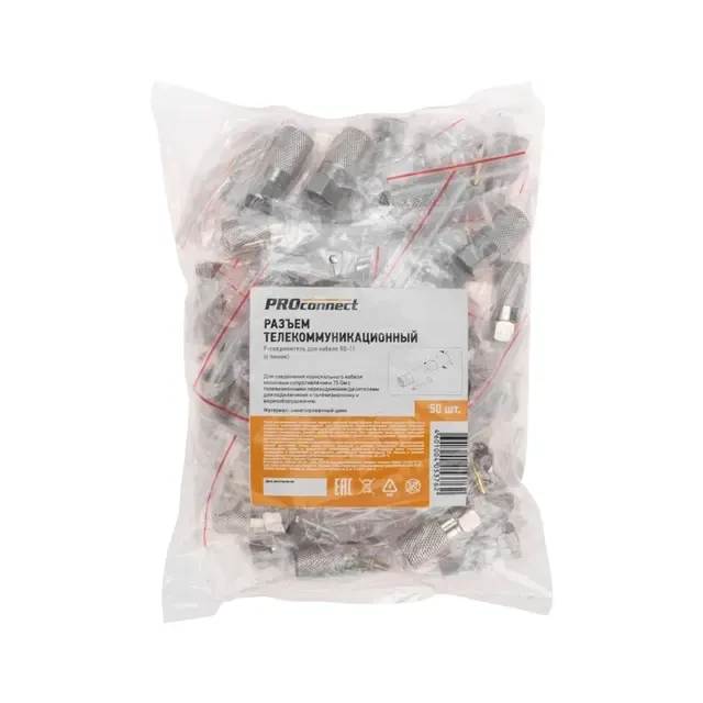 F-разъем RG-11 PROconnect– необходимый компонент, используемый при построении сети кабельного телевидения. Позволяет соединить магистральный коаксиальный кабель волновым сопротивлением 75 Ом с распределительными или оконечными устройствами, такими как усилителями, головными станциями и т.д. Выполнен из никелированного цинка. Для установки разъема необходимо накрутить его на кабель, предварительно зачистив контакты. Монтаж осуществляется быстро, так как не требует пайки контактов и использования специальных инструментов. Изделие оснащено специальной вставкой, через которую осуществляется переход с жилы кабеля RG-11 на стандартный размер штекера. Разъем подходит для кабелей типа RG-11, которые способны передавать сигналы на большие расстояния, а также для других коаксиальных кабелей, имеющих наружный диаметр около 10,3 мм.