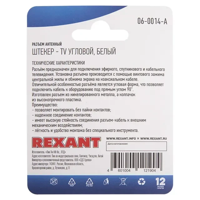 Описание REXANT 06-0014-A - Купить Разъем антенный