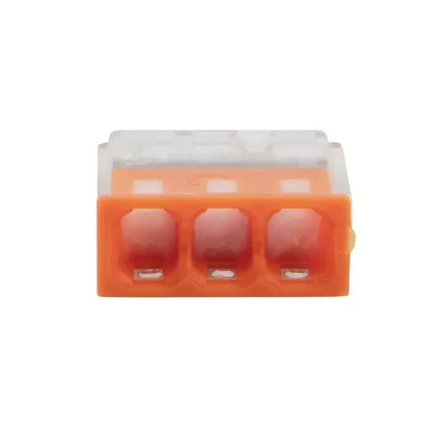 Строительно-монтажные экспресс-клеммы REXANT предназначены для подсоединения медных одножильных проводников. Они являются одним из самых быстрых, надежных и удобных способов монтажа проводников в условиях нехватки и ограничения площади. Обеспечивают экономию места до 50% по сравнению с простыми пружинными клеммами. Компактный прозрачный корпус удобен для контроля соединения, а яркая цветовая разметка способствует визуальному различию клемм по количеству проводников. Экспресс-клеммы одновременно подходят для медных и алюминиевых проводников. Прочный корпус из высококачественных материалов не поддерживает горение. Быстрый монтаж обеспечивается за счет пружинного способа соединения. Укомплектованы специальной контактной пастой, которая снимает окисную пленку с алюминиевых проводов и предохраняет их от повторного окисления. Технические характеристики: Материал корпуса: полиамид 66 Контакты: луженая медь Количество контактов: 3 Цвет: прозрачный Напряжение: 450 В Ток: 24 А Поддерживаемое сечение: 3x0,2-2,5 мм² (одножильный провод) Длина зачистки изоляции: 11 мм Рабочая температура: –40...+85 °С