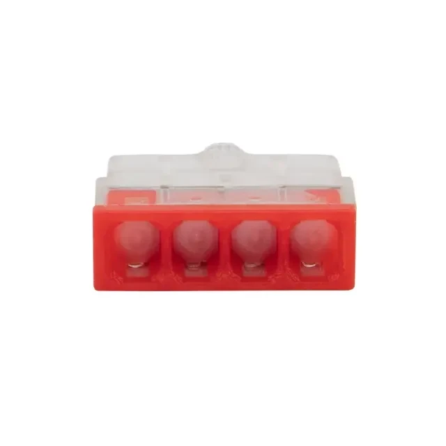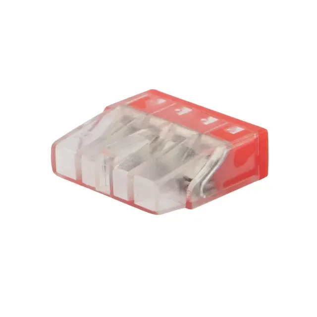Строительно-монтажные экспресс-клеммы REXANT предназначены для подсоединения медных одножильных проводников. Они являются одним из самых быстрых, надежных и удобных способов монтажа проводников в условиях нехватки и ограничения площади. Обеспечивают экономию места до 50% по сравнению с простыми пружинными клеммами. Компактный прозрачный корпус удобен для контроля соединения, а яркая цветовая разметка способствует визуальному различию клемм по количеству проводников. Экспресс-клеммы одновременно подходят для медных и алюминиевых проводников. Прочный корпус из высококачественных материалов не поддерживает горение. Быстрый монтаж обеспечивается за счет пружинного способа соединения. Укомплектованы специальной контактной пастой, которая снимает окисную пленку с алюминиевых проводов и предохраняет их от повторного окисления. Технические характеристики: Материал корпуса: полиамид 66 Контакты: луженая медь Количество контактов: 4 Цвет: прозрачный Напряжение: 450 В Ток: 24 А Поддерживаемое сечение: 4x0,2-2,5 мм² (одножильный провод) Длина зачистки изоляции: 11 мм Рабочая температура: –40...+85 °С