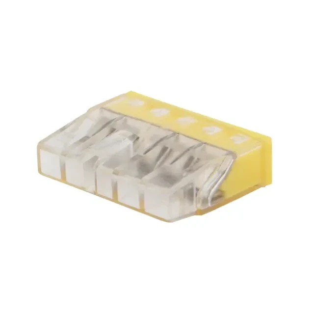 Строительно-монтажные экспресс-клеммы REXANT предназначены для подсоединения медных одножильных проводников. Они являются одним из самых быстрых, надежных и удобных способов монтажа проводников в условиях нехватки и ограничения площади. Обеспечивают экономию места до 50% по сравнению с простыми пружинными клеммами. Компактный прозрачный корпус удобен для контроля соединения, а яркая цветовая разметка способствует визуальному различию клемм по количеству проводников. Экспресс-клеммы одновременно подходят для медных и алюминиевых проводников. Прочный корпус из высококачественных материалов не поддерживает горение. Быстрый монтаж обеспечивается за счет пружинного способа соединения. Укомплектованы специальной контактной пастой, которая снимает окисную пленку с алюминиевых проводов и предохраняет их от повторного окисления. Технические характеристики: Материал корпуса: полиамид 66 Контакты: луженая медь Количество контактов: 5 Цвет: прозрачный Напряжение: 450 В Ток: 24 А Поддерживаемое сечение: 5x0,2-2,5 мм² (одножильный провод) Длина зачистки изоляции: 11 мм Рабочая температура: –40...+85 °С