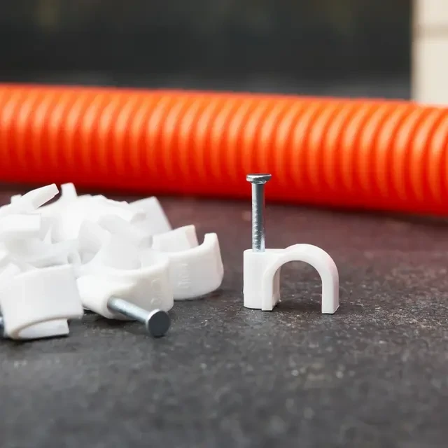 Круглый крепеж 8 мм с гвоздем предназначен для фиксации круглого кабеля к деревянной поверхности. Такой крепеж будет особенно полезен для использования на даче или в частном деревянном доме. Представляет собой дугообразную скобу белого цвета, выполненную из качественного пластика, с гвоздем в специальном отверстии. Скоба используется для мгновенного и надежного крепления проводов и кабелей к поверхностям стен, несущих конструкций и потолков. Гвоздь выполнен из закаленной стали, что позволяет закрепить его даже в плотной и твердой древесине без риска погнуть или сломать.
