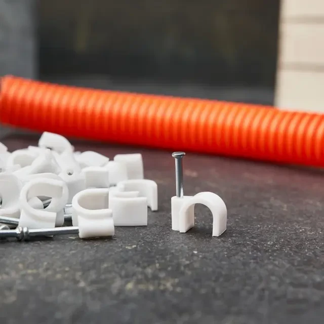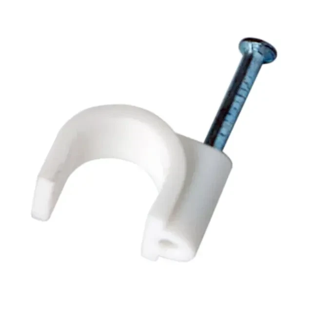 Круглый крепеж 9 мм с гвоздем предназначен для фиксации круглого кабеля к деревянной поверхности. Такой крепеж будет особенно полезен для использования на даче или в частном деревянном доме. Представляет собой дугообразную скобу белого цвета, выполненную из качественного пластика, с гвоздем в специальном отверстии. Скоба используется для мгновенного и надежного крепления проводов и кабелей к поверхностям стен, несущих конструкций и потолков. Гвоздь выполнен из закаленной стали, что позволяет закрепить его даже в плотной и твердой древесине без риска погнуть или сломать.