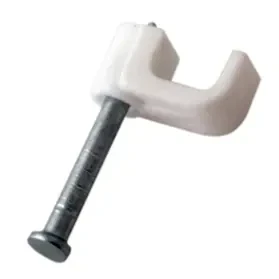 Плоский крепеж 4х2 мм с гвоздем предназначен для фиксации плоского кабеля к деревянной поверхности. Такой крепеж будет особенно полезен для использования на даче или в частном деревянном доме. Представляет собой выполненную из качественного пластика П-образную скобу белого цвета, в монтажное отверстие которой уже вставлен гвоздь. Скоба используется для мгновенного и надежного крепления проводов и кабелей к поверхностям стен, несущих конструкций и потолков. Гвоздь выполнен из закаленной стали, что позволяет закрепить его даже в плотной и твердой древесине без риска погнуть или сломать.
