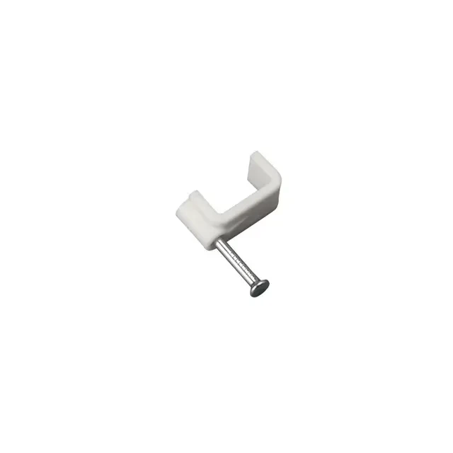 Плоский крепеж 14х7 мм с гвоздем предназначен для фиксации плоского кабеля к деревянной поверхности. Такой крепеж будет особенно полезен для использования на даче или в частном деревянном доме. Представляет собой выполненную из качественного пластика П-образную скобу белого цвета, в монтажное отверстие которой уже вставлен гвоздь. Скоба используется для мгновенного и надежного крепления проводов и кабелей к поверхностям стен, несущих конструкций и потолков. Гвоздь выполнен из закаленной стали, что позволяет закрепить его даже в плотной и твердой древесине без риска погнуть или сломать.