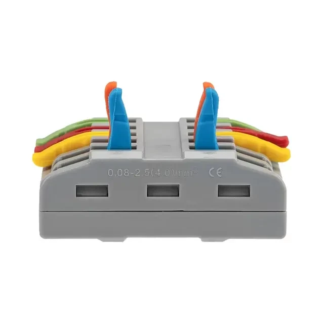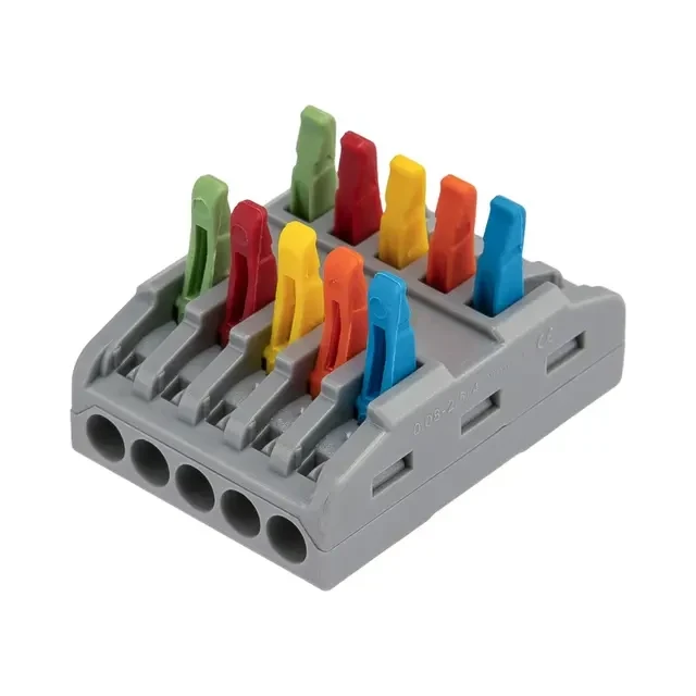 Многоразовые проходные клеммы REXANT предназначены для соединения медных одножильных и многожильных зачищенных проводников тонкого сечения. Состоит из 5 изолированных полюсов. Применяется для соединения или сращивания 5 пар проводов. Контакт осуществляется путем зажима проводника пластиной. Конструкция предотвращает случайное размыкание контакта. Специальное технологическое отверстие на корпусе клеммы предназначено для проверки соединения тестером-пробником или щупом мультиметра. Характеристики: Материал: Полиамид 66 Количество полюсов: 5 Материал контактов: луженая медь Зажим: сталь Цвет: серый Напряжение: 450 В Типы подключаемых проводов: одножильные, многожильные Ток: для одножильных проводов — 32 А, для многожильных проводов — 24 А Поддерживаемое сечение: 10x0.08-4 мм² (одножильный провод), 10x0.2-2,5 мм² (многожильный провод) Рабочая температура: –40...+85 °C Длина зачистки изоляции: 10 мм